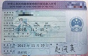 Chinese nationals with the right of abode in Macao can enter Hong Kong visa-free for a maximum period of 180 days solely with their Macao permanent identity card. Non-permanent residents of Macao can enter for up to 30 days if they hold a Visit Permit for Residents of Macao SAR to Hong Kong SAR.[12]