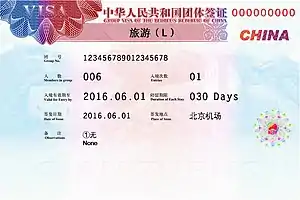 The government of the People's Republic of China allows holders of ordinary passports issued by some countries to travel to Mainland China for tourism or business purposes for up to 15, 30, 60 or 90 days without having to obtain a visa. Visitors of other nationalities, as well as residents of Hong Kong and Macau, are required to obtain either a visa or a permit prior to arrival, depending on their nationality. In order to increase the numbers of tourists visiting the country, some ports of entry of China allow nationals of certain countries to visit specified regions within 72 or 144 hours if they are in transit to a third country.[4] In 2014 the PRC government announced its intention to sign mutual visa facilitation and visa-free agreements with more countries in the future.[5] Since then, a number of such agreements were concluded with some countries.