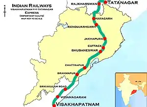 Visakhapatnam - Tatanagar Weekly Superfast Express is an intercity train of the Indian Railways connecting Visakhapatnam Junction in Andhra Pradesh and Tatanagar of Jharkhand. It is currently being operated with 20816/20815 train numbers on a weekly basis.[1][2] [3]