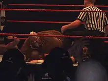 Viscera began wrestling in pajamas and making overtly sexual gestures in the ring. He became smitten with Raw ring announcer Lilian Garcia and tried different tactics to seduce her every week.[29][30] At Vengeance in June, Garcia finally reciprocated, proposing to him in the center of the ring, only to be turned down and left crying in the ring when The Godfather arrived with many of his hos to show Viscera what he would be leaving behind if he got married.[31] At the Royal Rumble, Viscera competed in the Royal Rumble match where he was eliminated by Carlito and Chris Masters. At WrestleMania 22, Viscera won an 18-man interpromotional battle royal. Viscera then teamed with Val Venis to form V–Squared. They teamed together for nearly nine months, mainly on Heat. They challenged for the World Tag Team Championship on several occasions, but never held the title.[32] When Venis was sidelined with a legitimate injury in April 2006, Viscera returned to singles wrestling. He attempted to reconcile with Garcia, but was interrupted and attacked by Umaga during his proposal.[33] Two weeks later, when Garcia was legitimately and accidentally knocked from the ring apron by Charlie Haas and sprained her wrist,[34] the incident was worked into a storyline of Haas and Viscera fighting over Garcia.[35] After Lillian declared she wanted to be just friends, Haas seemingly raked Viscera in the eye, with Viscera feigning to accidentally Samoan slam Lillian. After Viscera gave Lillian the Samoan slam, both men laughed about the incident, in the process turning Viscera heel once again.[36] The team split up when Haas reunited with Shelton Benjamin to reform The World's Greatest Tag Team.