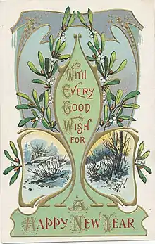 According to an old Christmas custom, a man and a woman who meet under a hanging of mistletoe were obliged to kiss. The custom may be of Scandinavian origin.[24] It was alluded to as common practice in 1808[25] and described in 1820 by American author Washington Irving in his The Sketch Book of Geoffrey Crayon, Gent.: