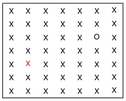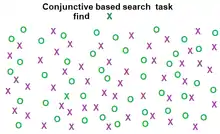 Conjunction search (also known as inefficient or serial search)[6] is a visual search process that focuses on identifying a previously requested target surrounded by distractors possessing no distinct features from the target itself.[10] An example of a conjunction search task is having a person identify a red X (target) amongst distractors composed of black Xs (same shape) and red Os (same color).[10] Unlike feature search, conjunction search involves distractors (or groups of distractors) that may differ from each other but exhibit at least one common feature with the target.[10] The efficiency of conjunction search in regards to reaction time(RT) and accuracy is dependent on the distractor-ratio[10] and the number of distractors present.[7] As the distractors represent the differing individual features of the target more equally amongst themselves(distractor-ratio effect), reaction time(RT) increases and accuracy decreases.[10] As the number of distractors present increases, the reaction time(RT) increases and the accuracy decreases.[6] However, with practice the original reaction time(RT) restraints of conjunction search tend to show improvement.[11] In the early stages of processing, conjunction search utilizes bottom-up processes to identify pre-specified features amongst the stimuli.[7] These processes are then overtaken by a more serial process of consciously evaluating the indicated features of the stimuli[7] in order to properly allocate one's focal spatial attention towards the stimulus that most accurately represents the target.[12]
