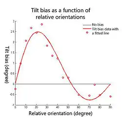 It has been reported that the magnitude and the direction of the perceived orientation shift depends on the relative orientation between test and contextual stimuli (see Fig.3). Psychophysics experiments have shown that relative orientations between 0 deg and about 50 deg produce repulsion effects (the test line or grating tends to rotate away from the contextual stimulus), which is known as the direct form of the tilt effect; but larger relative orientations up to 90 deg produce attraction effects (the test line or grating tends to rotate towards the contextual stimulus), which is known as the indirect form of the tilt effect. It has been observed repeatedly that indirect effects are smaller than direct effects.[2][3][4] The repulsion peak is about 3 degrees usually when the relative orientation between the test and contextual stimuli is around 20 degrees; and the attraction peak is usually maximally 0.5 degrees when the relative orientation is around 70 degrees (see Fig.3).