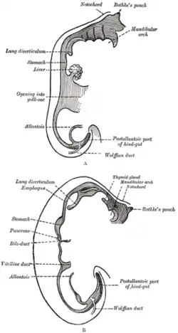 ![]() Sketches in profile of two stages in the development of the human digestive tube. (Vitelline duct labeled on bottom image.) | |