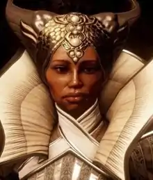 Vivienne is the mistress of a nobleman from the nation of Orlais, Duke Bastien de Ghyslain, and is recognized as the official enchanter to the Orlesian Imperial Court prior to the events of Inquisition. She is originally from Rivain, a realm in Thedas known for its human population's ethnic diversity as well as its unorthodox tolerance of marginalized or minority communities like the elves, mages and Qunari.[1] She is a member of the Circle of Magi organization, which is under the authority of the Chantry, a monotheistic religion who worship a deity known as the Maker and venerates the prophet Andraste, which mandates that "magic must serve man, not rule over him". Before a series of events that leads to the disbandment of the Circles of Magi and the opening of the Breach, she was in line to become the First Enchanter of the Montsimmard Circle in Orlais.[2][3] Vivienne has very specific views on the roles of the Chantry and the Circles of Magi, and that her motivations for joining the Inquisition to bring peace back into the world are very much ulterior.[2] Vivienne's specialization is "Knight-Enchanter", which adds a melee ability for mages and provides buffs to barriers and close-quarters combat.[4]
