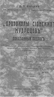 In 1930s, Burtsev fought against fascism and antisemitism. In 1934–1935 he was a witness in the Berne Trial, exposing the Okhrana's role in creating the infamous fraud The Protocols of the Elders of Zion. In 1938 in Paris he published a book The Protocols of the Elders of Zion: A Proven Forgery. Burtsev died in poverty in Paris in 1942 from a blood infection.