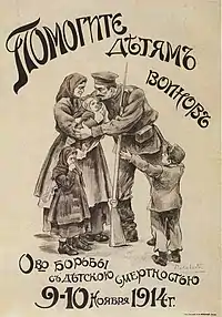 From 1920-1922, only a few years after the Revolution, Lebedev was hired to create more than 500 posters, or placards, for the Russian Telegraph Agency (ROSTA) and the Department for Agitation and Propaganda (Agitprop).[8] The goal in both cases was to promote the solidarity of the working class.[9] Since both newspapers and literacy were limited, the posters were strategically displayed in empty shop windows — known as ROSTA windows — which functioned as a crude form of mass communications.[6] Lebedev's posters were notable for their stark, simplified imagery: a single figure, in bold color, built from spare geometric forms, and engaged in varying kinds of labor.[6][8][9]