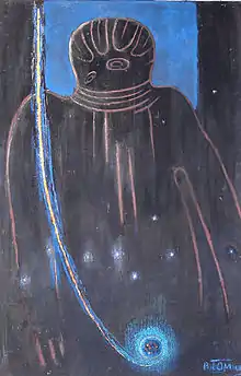 A new turn signified the late period of Tomilovsky’s creative live. His art became more laconic and the themes of endless cosmic eternity and the momentary human life became more pronounced. One can find these reflections in the works like ‘The Great Martian God’, where Tomilovsky depicted the supernatural forces, the universal mind, and the planet of Earth at its origin. In the late works of the artist, one would not find admiration of the Soviet construction sites anymore. Instead, the message about the fragility of our planet and its nature in front of relentless urbanisation and environmental concerns sounds stronger. The painting called On the edge of the 21st century is a vivid example of these concerns. An Irkutsk-based writer Larisa Lankina wrote in one of her articles that ‘the planet of Earth in Tomilovsky’s art resembles a fragile Christmas ball seen by the artist from the emptiness of the outer worlds; and it becomes the symbol of the human responsibility for its future’.