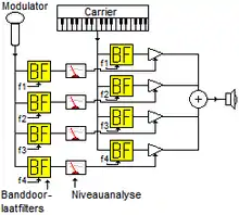 The amplitude of the modulator for each of the individual analysis bands generates a voltage that is used to control amplifiers for each of the corresponding carrier bands. The result is that frequency components of the modulating signal are mapped onto the carrier signal as discrete amplitude changes in each of the frequency bands.