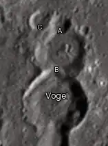 Vogel is a small lunar impact crater located to the southeast of Albategnius. It was named after the German astronomer Hermann Carl Vogel.[1] It is the smallest member of a trio of craters that increase in size from north to south, consisting of Vogel, Argelander and Airy. To the west is the remnant of the crater Parrot.