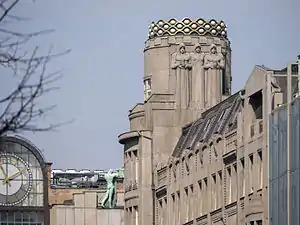 - the three figures at the crown of the Koruna Palace at the Wenceslas Square in Prague, 1912–1914