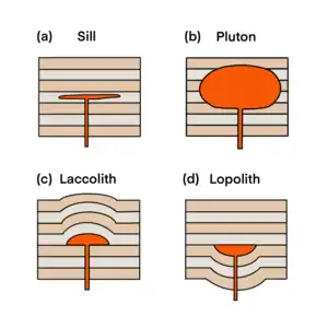 According to the depth of formation and geometry, magma emplacement can be classified into plutons, sills, laccoliths and lopoliths.