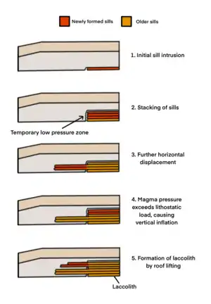 The formation of laccolith is governed by the jointing and faulting of the country rocks when emplacement begins.[27] These lines of weakness provide pathways for the formation of initial sill-like structures that are horizontal in shape.[27] At this stage, sheet intrusion is a more favourable mechanism of emplacement because the margins of the sheet cool faster, which creates shear zones that allow further horizontal displacement.[28] After some time, when the cooling rate decreases, and when the sills continue to stack onto one another, sheet intrusion is no longer a favourable mechanism because the zones of weakness diminish.[28] The cohesion between the sedimentary layers is also reducing because of displacement and deformation of the rock.[27] Here, inflation is a possible mechanism to continue the growth of intrusion. If, at this point, the surface area of the magma is large enough to generate a magma force that can overcome the lithostatic load of the overlying layer, vertical inflation can take place.[27] The vertical inflation of magma chambers creates laccoliths.[27]