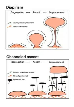 A diapir forms when a blob of buoyant, hot, and ductile magma ascends to a higher lithospheric layer.[10] Diapirism is considered as the main mechanism of magma transport in lower to middle crust[2] and it is one of the viable transportation mechanisms for both felsic and mafic magmas.[10]