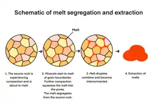 Melt segregation is the process of melt separating from its source rock. After the silica-rich melt is generated by partial melting, melt segregation is achieved by the gravitational compaction of the source rock.[5] It causes the squeezing of the melt through the pores and the melts are produced at grain boundaries.[5] When the melt droplets continue to build up and the proportion of melt continues to increase, they tend to gather together as melt pools.[6] The interconnectivity of the melt determines whether and when melt may be extracted.[6] When the melt percentage in the source rock approaches the first percolation threshold at 7%, the melt starts to migrate.[7] At this point, 80% of the grain boundaries are melted and the rock becomes very weak.[7] As melting advances and the melt continues to accumulate, it reaches the second percolation threshold at a melt percentage of 26% to 30%.[8] The matrix of the source rock will start to break down and the melt will start to be extracted.[3]