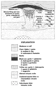 A cross-section of a typical volcanogenic massive sulfide (VMS) ore deposit as seen in the sedimentary record[1]
