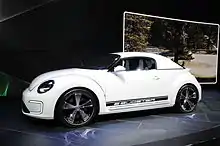 The e-Bugster was a concept vehicle shown at the North American International Auto Show in January 2012; it is a battery-electric vehicle using a 85 kW (114 hp; 116 PS) motor[14] drawing from a 28.3 kW-hr lithium ion traction battery, for a range of 110 miles (180 km). It previewed the styling for an anticipated convertible edition of the A5; compared to the conventional Beetle, the e-Bugster was 30 mm (1.2 in) wider and the roof was 90 mm (3.5 in) shorter. Unlike other new Beetles, the E-Bugster is a two-seater, true to its Speedster styling, instead of 2+2.[15] Volkswagen allowed journalist Damon Lavrinc to drive the prototype and explained the powertrain components were taken from the contemporary e-Golf that shared the VW PQ35 platform, produced for the California market. Top speed was limited to 30 mph (48 km/h) for the test drive.[16]