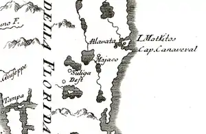 The indigenous Mayaca people inhabited much of the area now known as Volusia County along the St. Johns river. A settlement just south of Lake George known as Maiaca (or Mayaca) was likely the largest of the Mayaca villages.[6] Historical sources frequently refer to the native Timucua as having inhabited large areas of Florida including areas along the St. Johns river. However, other sources posit that the Mayaca were a distinct group of people with their own language, customs and settlements. Alliances were formed between smaller native groups. The village of Mayaca (Mayarca) was identified as belonging to the Outina confederation at one point, and with the Saltwater Timucua at another.[7]