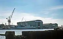 In the 1960s the company began to move into producing larger vessels, especially for the many emerging navies of post-colonial countries, including the Mark V or Alvand-class frigate, with VSEL, for the Iranian Navy.[2] Vosper alone, however, was unable to produce craft of this size, and in 1966 a merger with John I. Thornycroft & Company provided the shipbuilding capacity and experience to produce the larger vessels being designed by Vosper. The new group was known as Vosper Thornycroft. The former Vosper designs were developed by the new company into the Mark 10 or Niteroi-class frigates for the Brazilian Navy and subsequently elaborated into the handsome and pioneering Type 21 or Amazon-class frigate for the Royal Navy, the first major Royal Navy warship built to a private design since World War II. Vosper Thornycroft continued trading in Woolston, Southampton until 2003 when they relocated shipbuilding operations to Portsmouth operating as VT Group.[5]