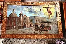 Past Mexican artists such as Frida Kahlo, Roberto Montenegro, Diego Rivera, Juan O'Gorman and David Alfaro Siqueiros have used elements of these paintings in their own work.[2][4] The influence of ex-votos is very clear in Frida Kahlo's Portrait of Wilhelm Kahlo, in which she writes about her father in text under his portrait, separated by a line.[2] Today, individual artists from diverse cultural backgrounds draw creative inspiration from this popular art form.[5] One such artist is Francisco Larios Osuna who creates painting in the votive form to document events from his own life as well as the lives of people he knows. However, unlike traditional votive paintings, these works are created by and for the artists and not for the subject of the piece. His work has been commissioned by the Mexican government and can be seen in the consulates located in Los Angeles, Miami, Houston and Brownsville .[12] Another area where the influence of votive paintings can be seen in mural work and other art in the west and southwest United States.[4]