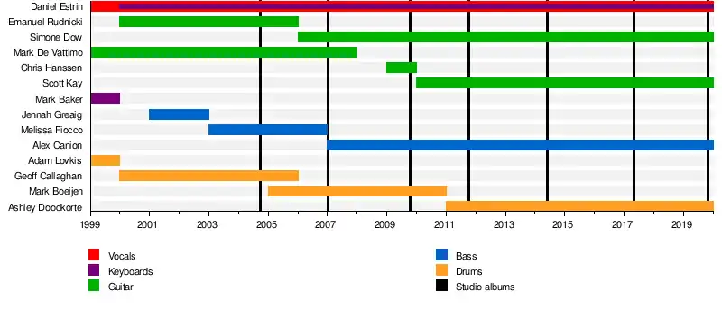 | Past members | Mark Boeijen (drums) (2005–2011) Chris Hanssen (guitar) (2009–2010) Mark De Vattimo (guitar) (1999–2008) Melissa Fiocco (bass) (2003–2007) Geoff Callaghan (drums) (2000–2006) Emanuel Rudnicki (guitar) (2000–2006) Jennah Greaig (bass) (2001–2003) Mark Baker (keys) (1999–2000) Adam Lovkis (drums) (1999–2000) |