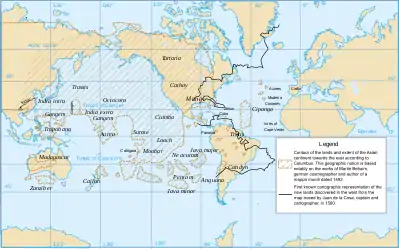 Many Europeans of Columbus's day assumed that a single, uninterrupted ocean surrounded Europe and Asia, although Norse explorers had colonized areas of North America beginning with Greenland c. 986.[1][2] The Norse maintained a presence in North America for hundreds of years, but contacts between their North American settlements and Europe had all but ceased by the early 15th century.[3][4][5]