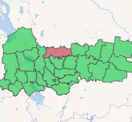 Vozhegodsky District (Russian: Вожего́дский райо́н) is an administrative[1] and municipal[8] district (raion), one of the twenty-six in Vologda Oblast, Russia. It is located in the north of the oblast and borders with Konoshsky District of Arkhangelsk Oblast in the north, Verkhovazhsky District in the east, Syamzhensky District in the southeast, Kharovsky District in the south, Ust-Kubinsky District in the southwest, and with Kirillovsky District in the west. The area of the district is 5,500 square kilometers (2,100 sq mi).[4] Its administrative center is the urban locality (a work settlement) of Vozhega.[3] Population: 16,790 (2010 Census);[5] 18,976 (2002 Census);[10] 22,470 (1989 Census).[11] The population of Vozhega accounts for 40.1% of the district's total population.[5]