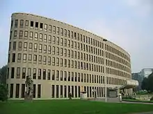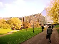 Most of the faculties are located on the Etterbeek campus (which is actually located on the territory of the neighbouring borough of Elsene). It is the livelier of the two campuses and consists almost entirely of concrete structures, most built in the 1970s. Some are decaying rapidly but at least one, the Rectoraat designed by Renaat Braem, is heritage-listed.[22] Activities take place in numerous auditoriums and labs. In addition, there is a modern sports centre, a football pitch encircled by a running track, and a swimming pool. For eating out, there is a restaurant with subsidies for students and staff, and the bars/cafes 't Complex, Opinio, and KultuurKaffee. The KultuurKaffee was a full-fledged concert venue during the evening/night, offering the university a cultural scene and organising free concerts and events. It was demolished to make space for the new XY construction project in 2015.[23]
