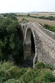 The Ponte dell'Abbadia[17] over the Fiora is a Roman bridge with a main arch of 20 m span and 30 m above the stream and was built upon an Etruscan bridge (the Tufo buttresses are very probably Etruscan, for they are evidently the piers of the original bridge). It carried the ancient road and the Romans, unusually, incorporated an aqueduct on it leading to Vulci about 1.5 km away. The overflow of the aqueduct after it fell into disrepair caused the "curtain of stalactites".