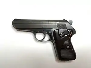 After the Second World War, Czechoslovakia's Ministry of the Interior requested a new pistol design from Česká zbrojovka Uherský Brod. The resulting gun was chambered in .32 ACP and designed by two brothers Jan and Jaroslav Kratochvíl. It combined elements from both the Walther PP and PPK.[2] The pistol is fed from an 8-round single-stack magazine, located within the bakelite paneled grip. Small fixed sights are located on top of the slide. The pistol functions via the blowback principle - gas pressure from burning powder simultaneously forces the cartridge case and slide backward and forces the bullet forward in the barrel. After it reaches the end of its rearward travel, the recoil spring returns the slide to its forward position, stripping and chambering a new round from the magazine as it does so, rendering the gun ready to fire again. Hammer and trigger operation is single and double action .[3][2]