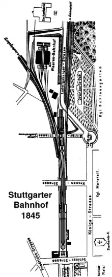 The Central Railway (German: Zentralbahn or Centralbahn) was the first phase of the Württemberg railways. It was built between 1844 and 1846 by the Royal Württemberg State Railways (Königlich Württembergischen Staats-Eisenbahnen) and consisted of two branches, running from Stuttgart to Ludwigsburg in the north and from Stuttgart to Esslingen in the east.