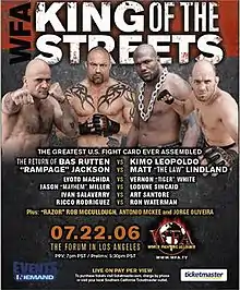 WFA: King of the Streets was a mixed martial arts event held by World Fighting Alliance on July 22, 2006 at the Great Western Forum in Los Angeles, California, USA. This would be the last event held by the World Fighting Alliance. The event was seen live on pay per view in the United States via iN DEMAND, and is the only fight in the 21st century to feature former UFC champion[2] Bas Rutten.[3] Rutten's win over Warpath capped a 22 fight win streak, dating back to 1995, to end his career.[4]