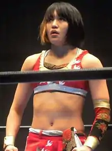 On October 12, 2012, Tajiri, the founder of Wrestling New Classic (WNC), announced the creation of the WNC Women's Championship, with a six-woman single-elimination tournament starting on October 26 in Korakuen Hall.[1] The six participants were announced as Kana, Syuri, Lin Byron, Makoto, Nagisa Nozaki and Jessica Love, a Finnish wrestler, who was born male, but underwent a sex reassignment surgery in 2011 to legally become female.[1] The first round of the tournament was decided that same day by a random draw, conducted by Tajiri and WNC president Tsutomu Takashima, which resulted in Love and Nozaki getting byes directly to the semifinals.[1][9] The first first round match took place on October 26 and saw Syuri defeat Lin Byron to advance to the semifinals against Jessica Love.[10] The second first round match took place on November 26 and saw Kana defeat Makoto to advance to the semifinals against Nagisa Nozaki.[11] In the semifinals two days later, Syuri defeated Jessica Love, while Nagisa Nozaki eliminated the inaugural Smash Diva Champion, Kana, setting up a final match between the two.[12] On December 27, Syuri, the final Smash Diva Champion, defeated Nagisa Nozaki to become the inaugural WNC Women's Champion.[4][13][14][15]