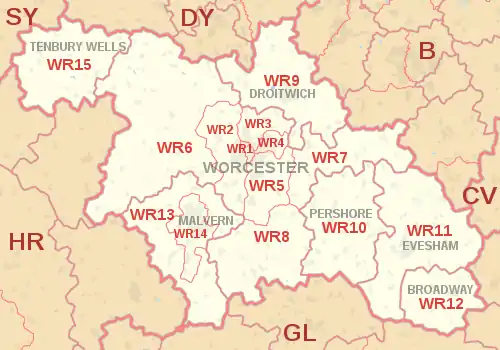 The WR postcode area, also known as the Worcester postcode area,[2] is a group of fifteen postcode districts in England, within seven post towns. These cover central and southern Worcestershire (including Worcester, Broadway, Droitwich, Evesham, Malvern, Pershore and Tenbury Wells), plus very small parts of Herefordshire, Shropshire, Warwickshire and Gloucestershire.