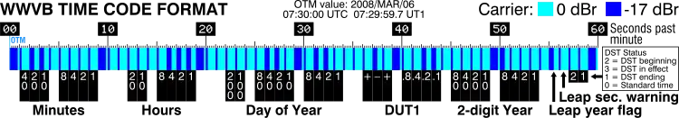 In the following diagram, the cyan (0 dBr) blocks indicate the full strength carrier, and the dark blue (−17 dBr) blocks indicate the reduced strength carrier. The widest dark blue blocks — the longest intervals (0.8 s) of reduced carrier strength — are the markers, occurring in seconds 0, 9, 19, 29, 39, 49, and 59. Of the remaining dark blue blocks, the narrowest represent reduced carrier strength of 0.2 seconds duration, hence data bits of value zero. Those of intermediate width (for example, in seconds :02 and :03) represent reduced carrier strength of 0.5 seconds duration, hence data bits of value one.