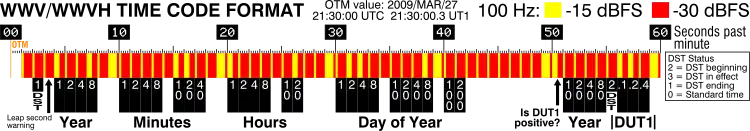 - Binary-coded decimal time code of date and time, transmitted as varying length pulses of 100 Hz tone, one bit per second.[35]