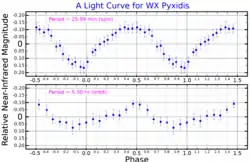 ![]() Near-infrared (J band) light curves for WX Pyxidis, showing variation over the white dwarf rotation period (top) and orbital period (bottom). Adapted from Joshi et al. (2011)[1] | |