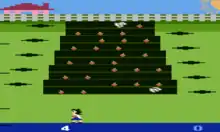 Wabbit is a farming simulation game with elements of the shoot 'em up genre in which the player controls a female character named "Billie Sue".[1] Rabbits have descended upon Sue's farm and are quickly devouring her crop of carrots. In order to ward off the rabbits, the player must throw rotten eggs at them before they are able to carry away Sue's carrots.[2][3] The player scores points by hitting rabbits, and the rabbits score points by carrying carrots off-screen. As the player's score increases, the rabbits move progressively faster.[4] The game ends when either the player scores 1300 points or the rabbits steal 100 carrots.[5][4]
