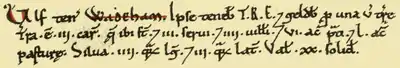 - Ulf ten(et) WADEHAM. Ipse teneb(at) T(empore) E(dwardi) R(egis). Geld(a)b(at) p(ro) una v(irgata) t(er)rae. T(er)ra e(st) III car(rucis) q(uae) ibi s(un)t. III servi, IIII vill(an)i, VI ac(rae) pti L ac(rae) pasturae, silva IIII l(on)g(a) III lat(a). Valet XX solidii ("Ulf holds Wadham. He himself held it in the time of King Edward (the Confessor). It paid tax for 1 virgate of land. Land for 3 ploughs which are there. 3 slaves, 4 villagers, 6 acres of ..., 50 acres of pasture, wood 4 furlongs long, 3 furlongs wide. It is worth 20 shillings).