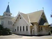 The building is noted for its eclectic exterior ornamentation and its combination of Colonial Revival (sometimes classified as Romanesque Revival) and Carpenter Gothic Victorian architecture.[4] The Los Angeles Cultural Heritage Board has described the Wadsworth Chapel and other original buildings on the Veterans campus as "the most monumental complex of Shingle-style Queen Anne structures ever constructed in the Los Angeles area."[5] The 7,500-square-foot (700 m2) building was built at a cost of $12,400 in 1900 with redwood siding and 21 different types of windows.[3]