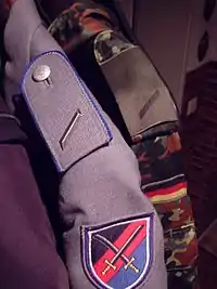 In the German military, Waffenfarbe (German: "branch-of-service color" or "corps color") is a visual method that the armed forces use to distinguish between different corps or troop functions in its armed services. The Waffenfarbe itself can take the form of the color of the collar patch, of the piping (embellishment) around the shoulder boards or shoulder marks, or—for enlisted ranks—of the piping around the collar and the garrison cap (Schiffchen). (In the latter places, NCOs wear cords of dark gold, officers silver, and generals gold.)[1]