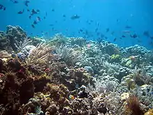 Habitats found in the national park are mangrove forest, coastal forest, lowland swamp forest, riverbank vegetation, lowland rainforest, mountain rainforest and coral reefs. The Wakatobi Archipelago has 25 groups of coral reefs including fringing reefs, barrier reefs and atolls.[3] A survey conducted in 2003 identified 396 species of coral belonging to 68 genera and 15 families.[5] These include Acropora formosa, Acropora hyacinthus, Psammocora profundasafla, Pavona cactus, Leptoseris yabei, Fungia molucensis, Lobophyllia robusta, Merulina ampliata, Platygyra versifora, Euphyllia glabrescens, Tubastraea frondes, Stylophora pistillata, Sarcophyton throchelliophorum, and Sinularia species.[6]