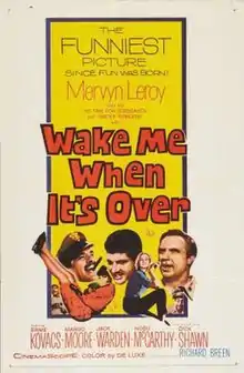 Wake Me When It's Over is a 1960 DeLuxe Color comedy film directed by Mervyn LeRoy and starring Ernie Kovacs and Dick Shawn in CinemaScope. The screenplay concerns a World War II veteran who gets called back into service by mistake and sent to a dreary Pacific island. The film is based on the novel of the same name by Howard Singer.