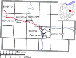 The Walhonding Canal was a canal in Coshocton County, Ohio that was used as a feeder canal for the Ohio and Erie Canal. A small canal, at only 25 miles (40.2 km) long, it was wholly contained within Coshocton County, following the Mohican River from Cavallo south to the confluence with the Kokosing River, which together with the Mohican forms the Walhonding River. The canal followed the Walhonding River southeast toward Coshocton where it met the Ohio and Erie Canal in Roscoe Village.