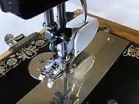A walking foot is a mechanism for feeding the workpiece through a sewing machine as it is being stitched. It is most useful for sewing heavy materials where needle feed is mechanically inadequate, for spongy or cushioned materials where lifting the foot out of contact with the material helps in the feeding action, and for sewing many layers together where a drop feed will cause the lower layers to shift out of position with the upper layers. A walking foot is also good for sewing materials with varying layers because it can climb up and down these layers easier than other feeding mechanisms.[1]