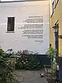 The Wall Poems project was partly funded by the private Tegen-Beeld foundation of Ben Walenkamp and Jan Willem Bruins, the project's two artists, with additional funding from several corporations and the city of Leiden.[2][4] It began in 1992 with a poem in Russian by Marina Tsvetaeva and (temporarily) finished in 2005 with the Spanish poem De Profundis by Federico García Lorca.[4] Other poets included in the set include E. E. Cummings, Langston Hughes, Jan Hanlo, Du Fu, Louis Oliver, Pablo Neruda, Rainer Maria Rilke, William Shakespeare, and W. B. Yeats,[3][5] as well as local writers Piet Paaltjens and J. C. Bloem.[4] One of the more obscure poems in the collection is written in the Buginese language on a canal wall near the Royal Netherlands Institute of Southeast Asian and Caribbean Studies; it and many of the other poems are accompanied by plaques with translations into Dutch and English.[2]