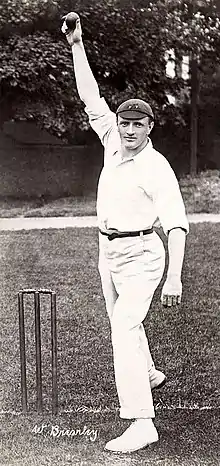 Brearley was a fast bowler with what Wisden described as "a rolling gait"[2] who put his full – and substantial – weight into achieving pace and swing. He played county cricket only from the age of 26, but his ability to make the ball rise sharply on the somewhat fiery Old Trafford wickets became noticed the following year, but after the wickets became less difficult he was dropped from the side. The following year, his bowling was a valuable part of Lancashire's finest season in county cricket (sixteen wins and no losses) but his inability to play late in the season attracted the notice of Wisden.