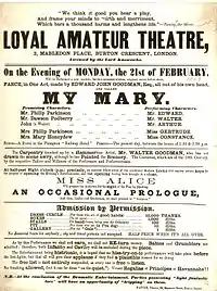Goodman is also credited with a portrait of the then Duke of Edinburgh (Queen Victoria's second son Alfred). His last Royal Academy submission (1888) was a portrait entitled Mrs. Keeley in her 83rd Year which is recorded as having subsequently found its way to London's bohemian Savage Club, of which the artist was a member from 1873 to 1894 and where his brother Edward was chairman of the committee.[50] Another Keeley painting, Mrs. Keeley at Fourscore (now housed at the Garrick Club) was exhibited at Institute of Oil Painters and Bond Street's Burlington Gallery[51] in 1885. Goodman was an admirer of Mary Anne Keeley and her acting family, publishing an appreciation in 1895 entitled The Keeleys on the Stage and at Home, which contains engravings of several of his portrait paintings. Goodman's life interest in the theatre culminated in an appearance with Mrs. Keeley in a full-scale production on the stage of the Prince of Wales Theatre on the night of 16 January 1884. At about the same time he painted the actress, Mrs. Alfred Mellon (née Sarah Woolgar). Another actress whose portrait Goodman painted was Amy Sedgwick. A year after her death in 1897, her third husband presented the portrait to the Garrick Club, where it remained until 1969.[52] Other arts-related personalities who were captured by Goodman's brush included Negro Delineator, E. W. Mackney, the dramatist Henry Pettitt and composer Sir George A. MacFarren (who also sat for Goodman's mother Julia).
