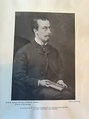 Goodman's trip to Windsor might have led to The Queen's son, Prince Leopold, Duke of Albany, sitting for Goodman (the Prince never sat for another artist). The Prince had his final sitting in March 1881 at Windsor Castle[40] His portrait was submitted to the Royal Academy in 1881. A court circular from Marlborough House dated 28 July 1884 notes that Goodman submitted the portrait of The Duke of Albany to the Prince and Princess of Wales, from where it was currently displayed in a place of honour surrounded by flowers[41] (The Prince had died earlier that year) at the exhibition of the City of London Society of Artists at the old law courts of The Guildhall.[42] The painting was purchased around 1884 by The National Hospital in Queen Square, London.[43][44] The hospital has no record of the present whereabouts of the painting.