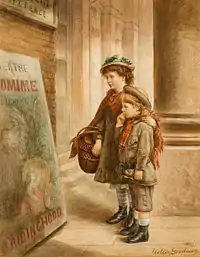In the summer of 1883 Goodman sold two oil paintings at J.P. Mendoza's St. James's Gallery at King Street in London – Fresh and Pure (also known as Pure and Undefiled) and Candidate for the Front Row (also known as First at the Gallery Door). Goodman was a member of London's Savage Club and in 1883 submitted a drawing of the club president, Andrew Halliday, to the club tombola.[45] Goodman was very fond of pantomime as a child,[46] and depicted in pencil and water colour two children at the door of Drury Lane Theatre, staring longingly at the advertising poster for Little Red Riding Hood. In 1888 Goodman would paint the retired pantomime clown, Tom Matthews, in his 88th year.